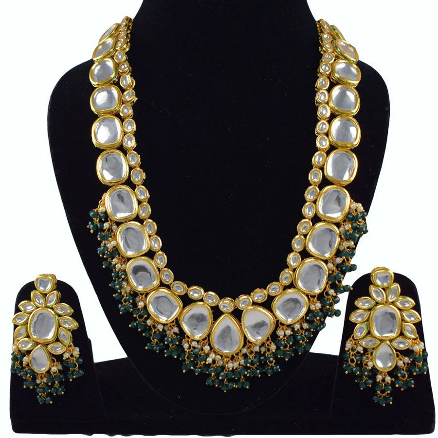 Gold Rodium Polish Green color Necklace in Metal Alloy studded with Beads, Kundan