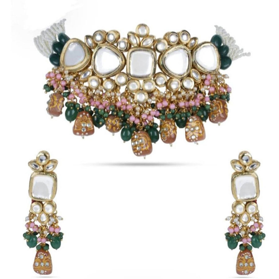 Gold Rodium Polish Green, Orange color Necklace in Metal Alloy studded with Beads, Kundan