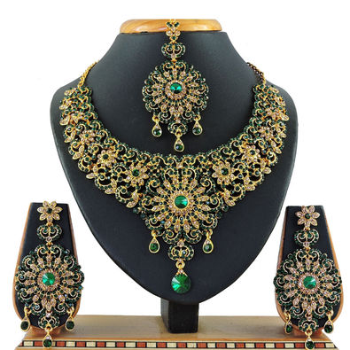 Gold Rodium Polish Green color Necklace in Metal Alloy studded with CZ Diamond