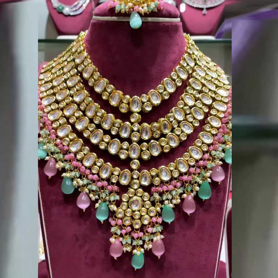 Gold Rodium Polish Green, Pink and Majenta color Necklace in Metal Alloy studded with Kundan, Pearl