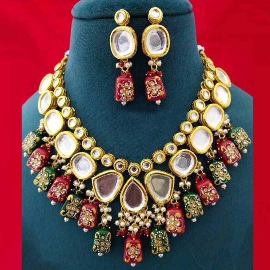 Gold Rodium Polish Green, Red and Maroon color Necklace in Metal Alloy studded with Kundan, Pearl