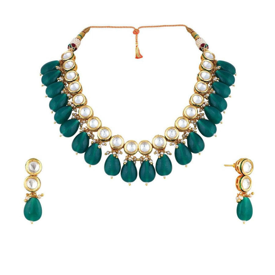 Gold Rodium Polish Green color Necklace in Metal Alloy studded with Beads, Kundan