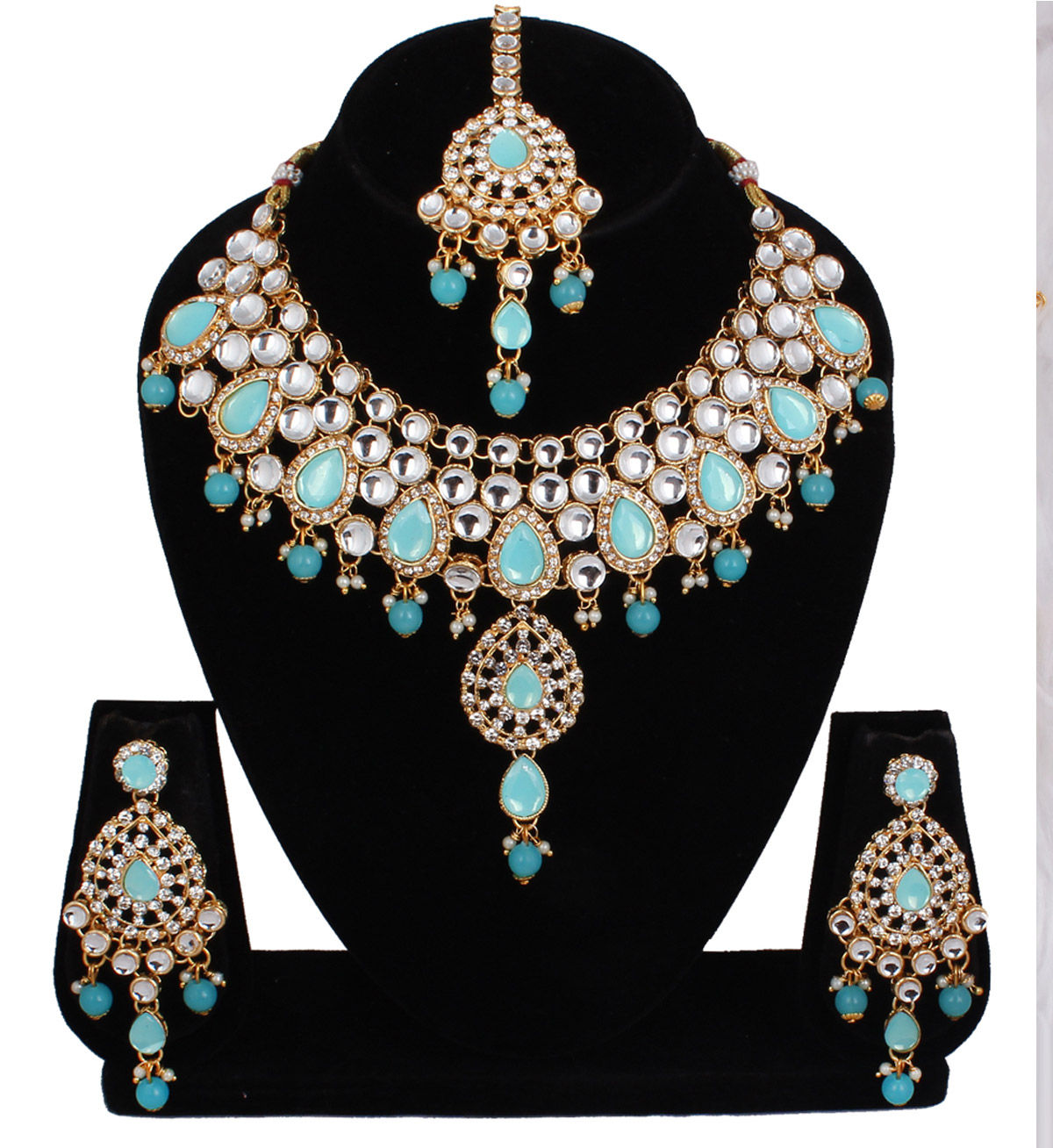 Gold Rodium Polish Green color Necklace in Metal Alloy studded with Austrian diamond, Kundan