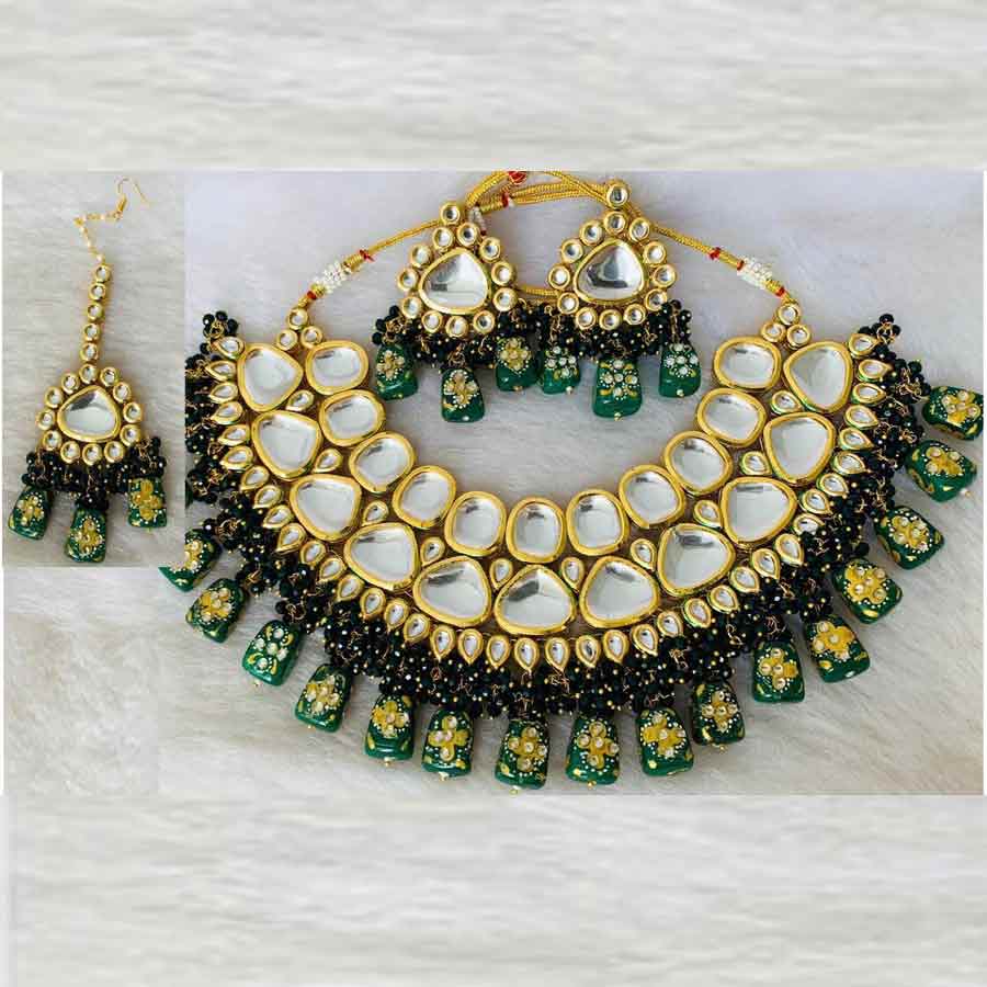 Gold Rodium Polish Green color Necklace in Metal Alloy studded with Kundan