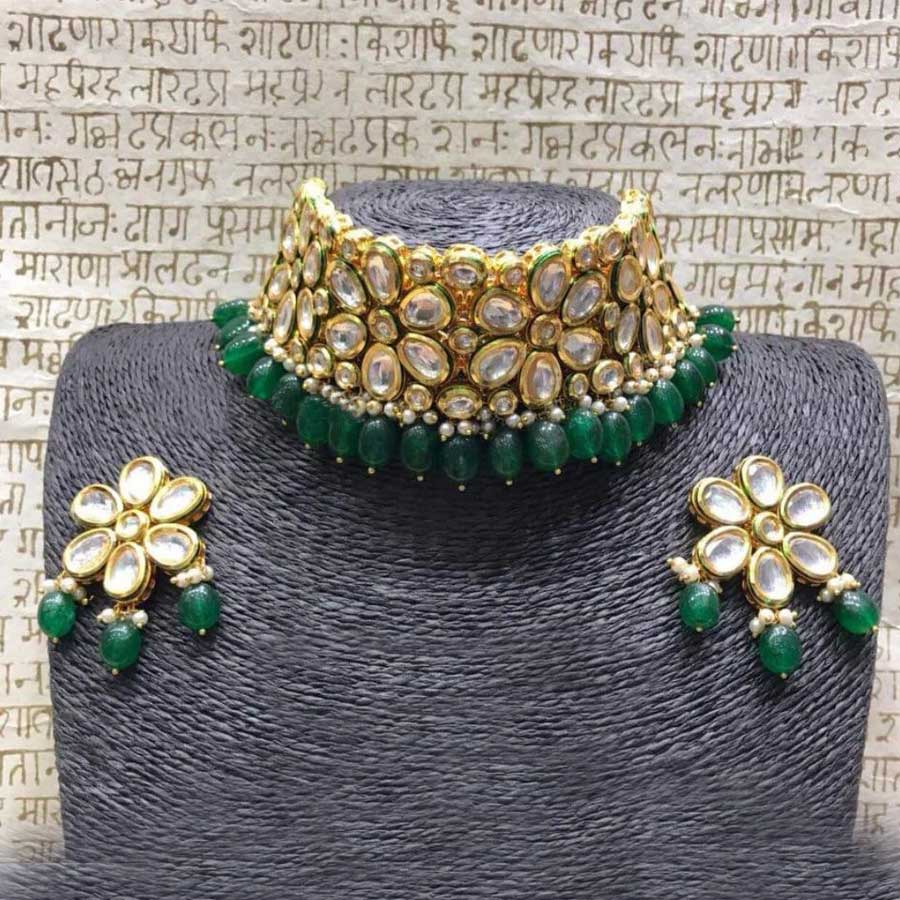 Gold Rodium Polish Green Necklace in Metal Alloy with Kundan