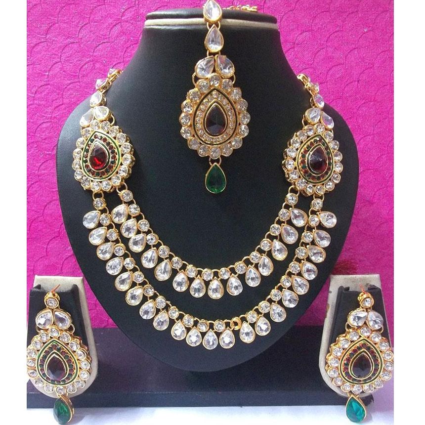 Gold Rodium Polish Multicolor color Necklace in Metal Alloy studded with CZ Diamond, Kundan