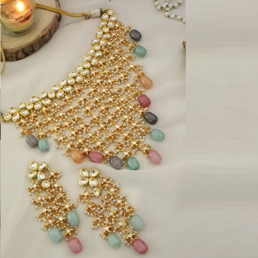 Gold Rodium Polish Multicolor color Necklace in Metal Alloy studded with Beads, Kundan