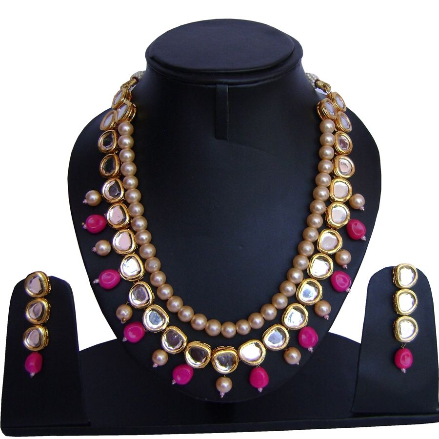 Gold Rodium Polish Pink and Majenta color Necklace in Metal Alloy studded with Beads, Kundan