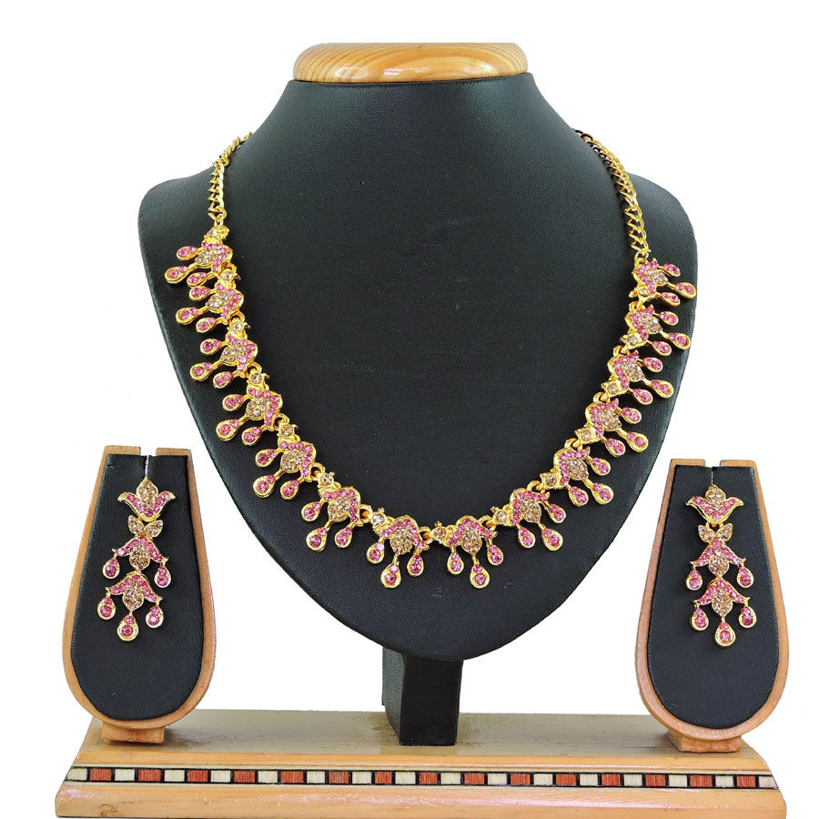 Gold Rodium Polish Pink and Majenta color Necklace in Metal Alloy studded with CZ Diamond