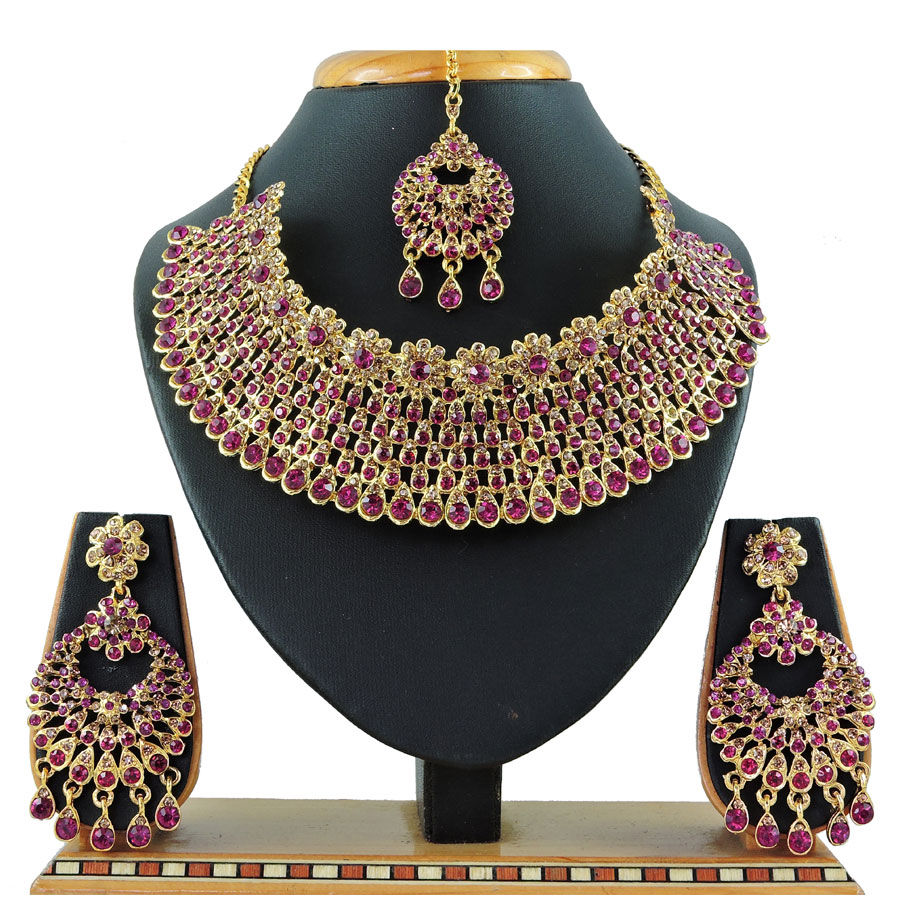 Gold Rodium Polish Gold, Pink and Majenta color Necklace in Metal Alloy studded with CZ Diamond