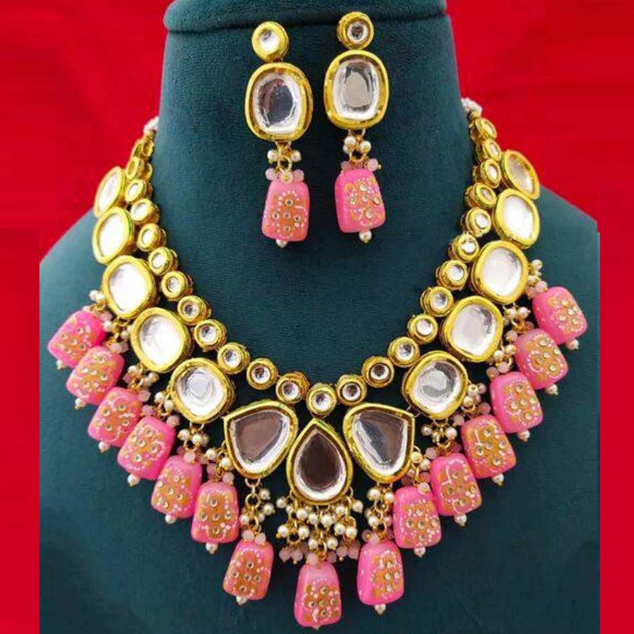 Gold Rodium Polish Pink and Majenta color Necklace in Metal Alloy studded with Kundan, Pearl