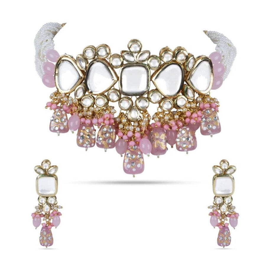 Gold Rodium Polish Pink and Majenta color Necklace in Metal Alloy studded with Beads, Kundan