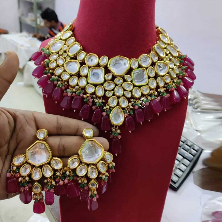 Gold Rodium Polish Pink and Majenta Necklace in Metal Alloy with Kundan