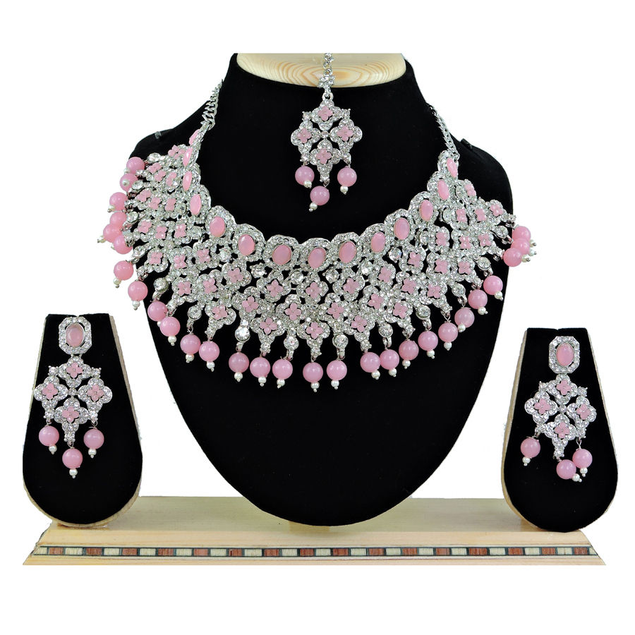 Gold Rodium Polish Pink and Majenta color Necklace in Metal Alloy studded with Austrian diamond, Pearl