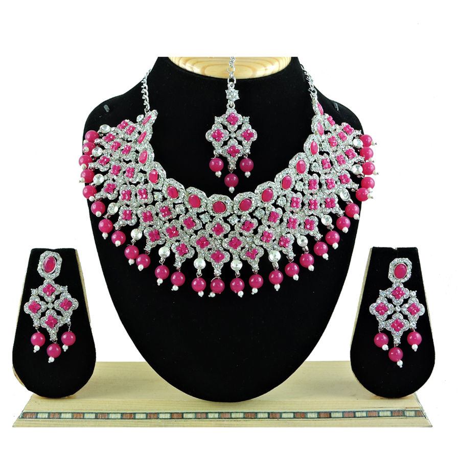 Gold Rodium Polish Pink and Majenta color Necklace in Metal Alloy studded with Austrian diamond, Pearl