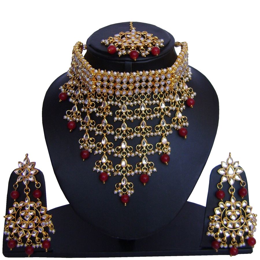 Gold Rodium Polish Red and Maroon color Necklace in Metal Alloy studded with Beads, Kundan