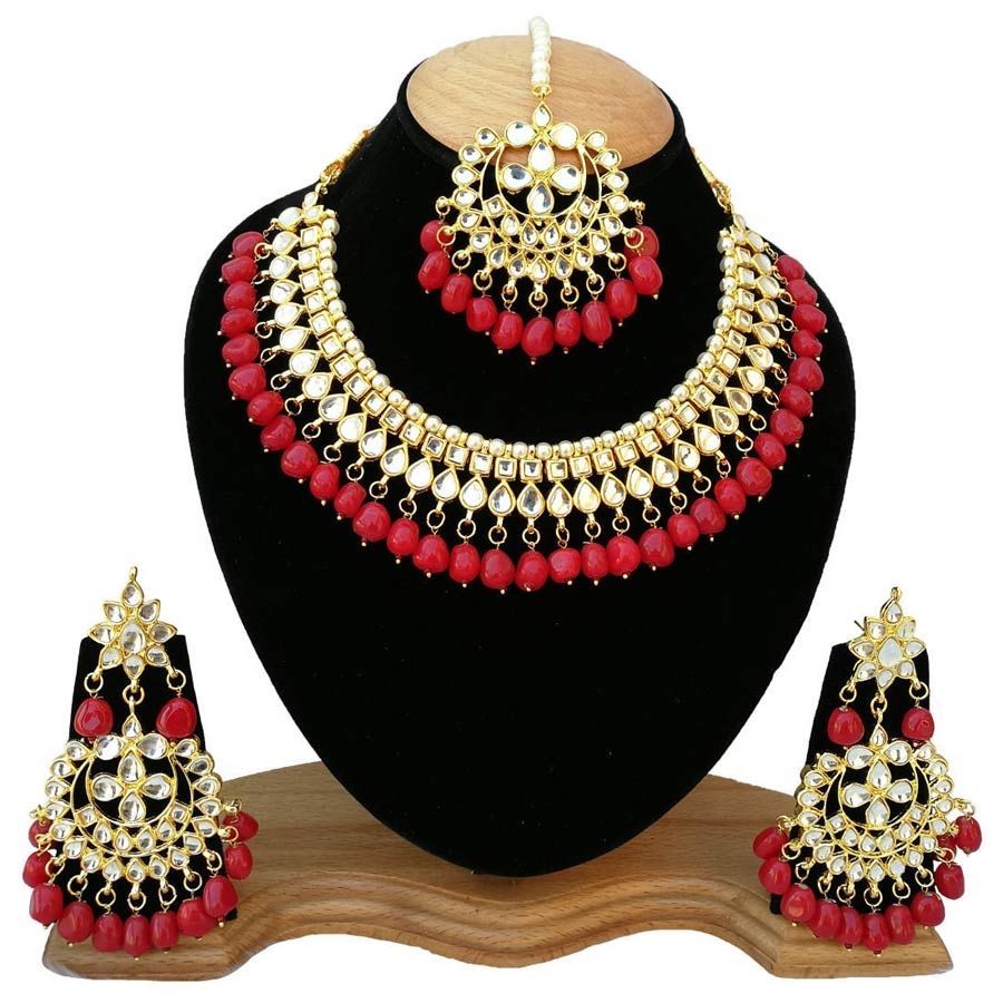 Gold Rodium Polish Red and Maroon Necklace in Metal Alloy with Kundan