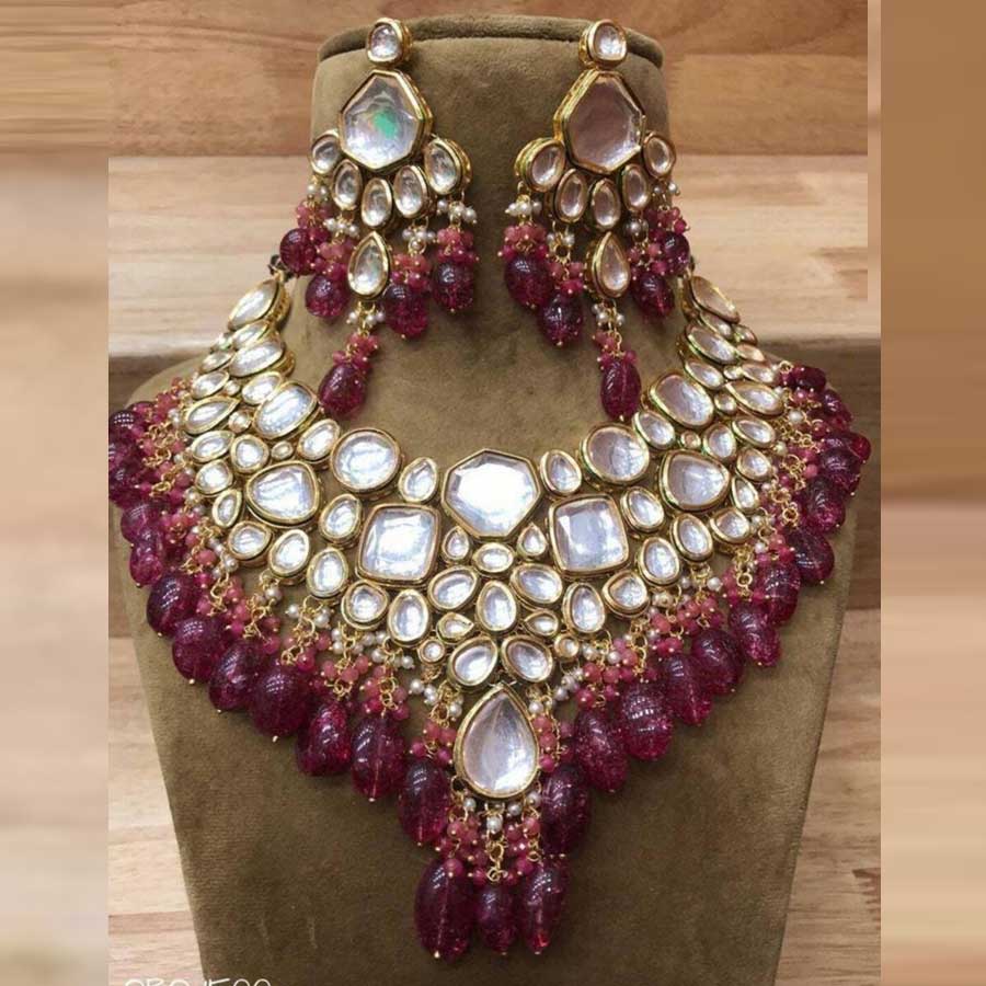 Gold Rodium Polish Red and Maroon color Necklace in Metal Alloy studded with Beads, Kundan