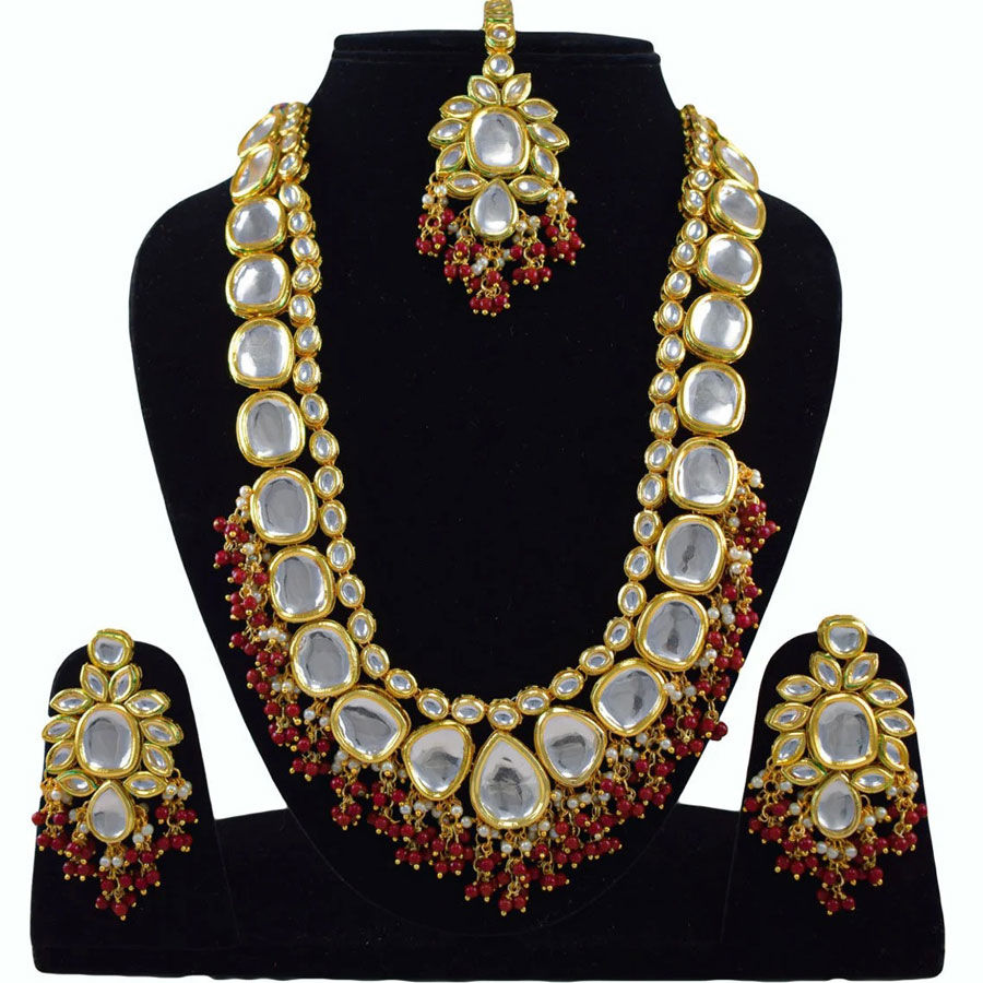 Gold Rodium Polish Red and Maroon color Necklace in Metal Alloy studded with Beads, Kundan
