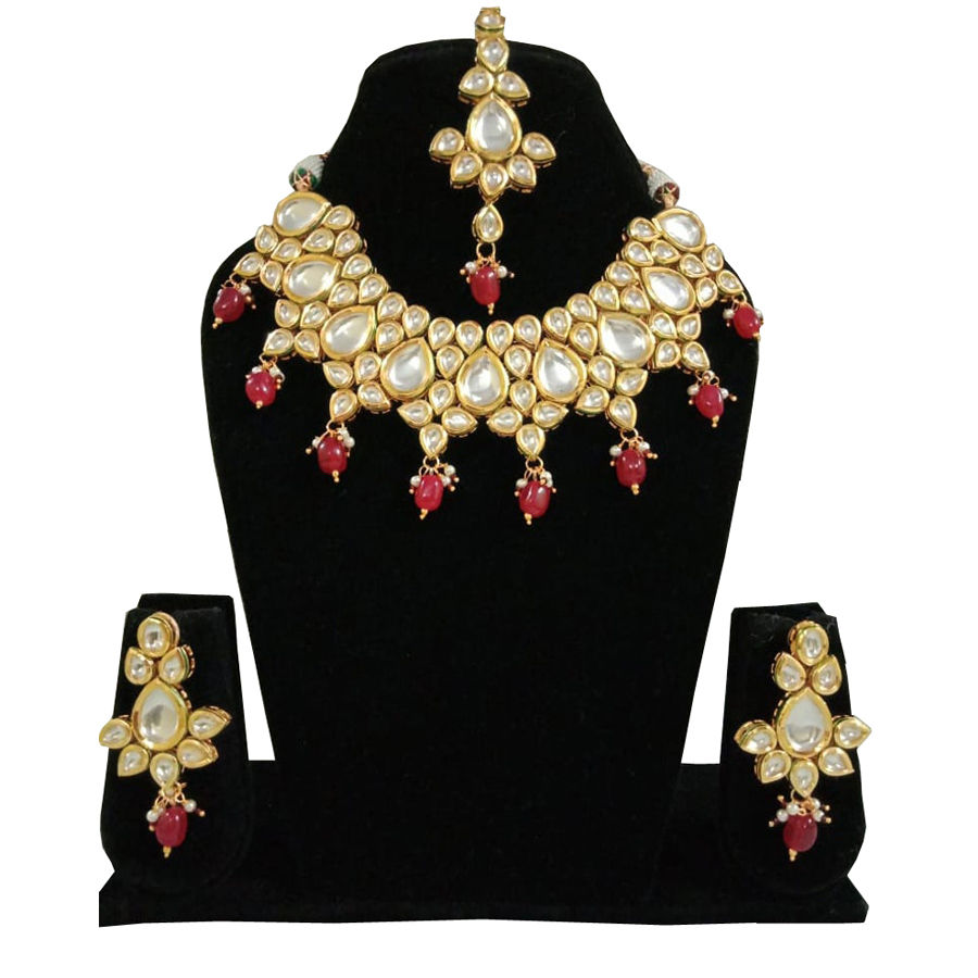 Gold Rodium Polish Red and Maroon, White and Off White color Necklace in Metal Alloy studded with Kundan