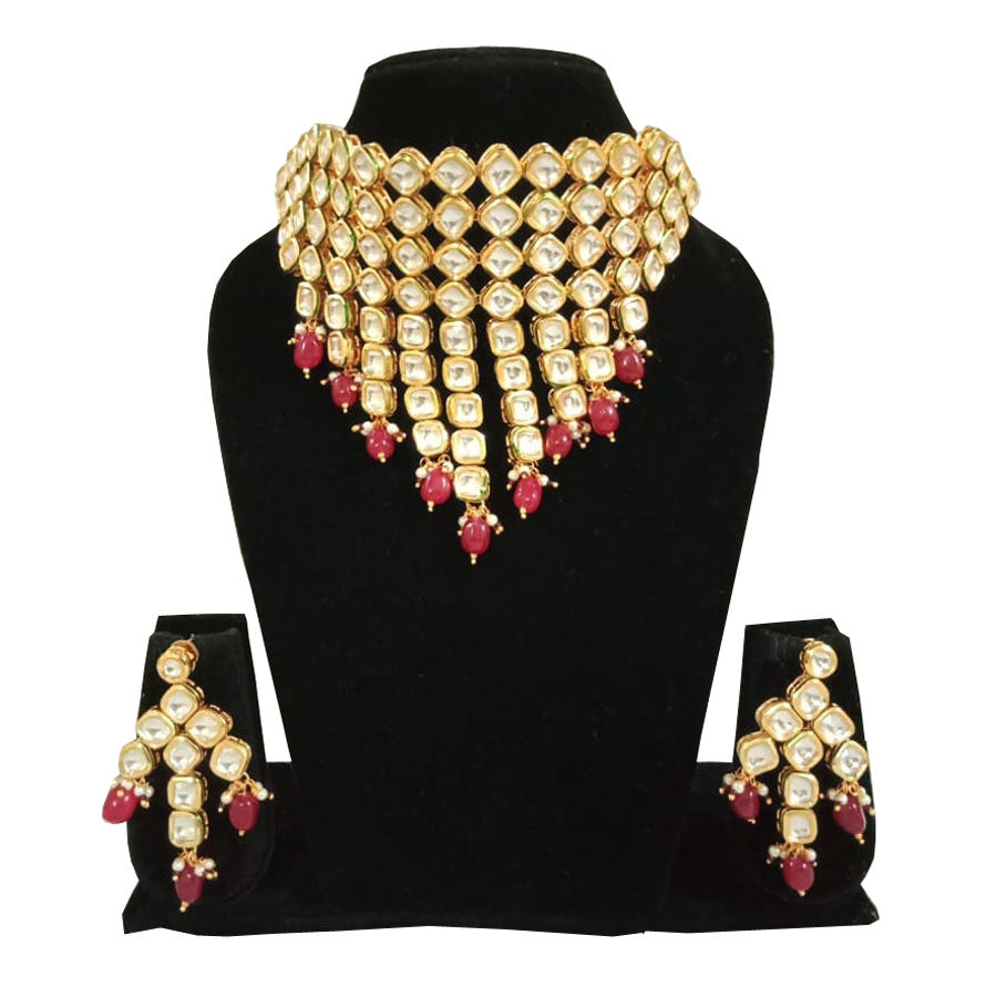 Gold Rodium Polish Red and Maroon, White and Off White color Necklace in Metal Alloy studded with Kundan