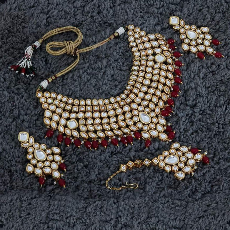 Gold Rodium Polish Red and Maroon, White and Off White color Necklace in Metal Alloy studded with Kundan
