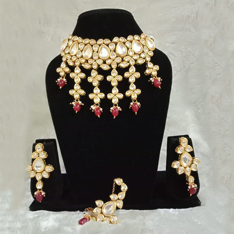 Gold Rodium Polish Red and Maroon, White and Off White color Necklace in Metal Alloy studded with Kundan
