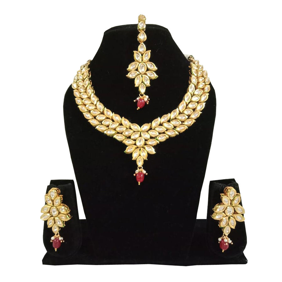 Gold Rodium Polish Red and Maroon, White and Off White color Necklace in Metal Alloy studded with Kundan