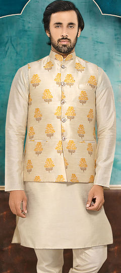 Silk Nehru Jacket in Beige and Brown with Floral work