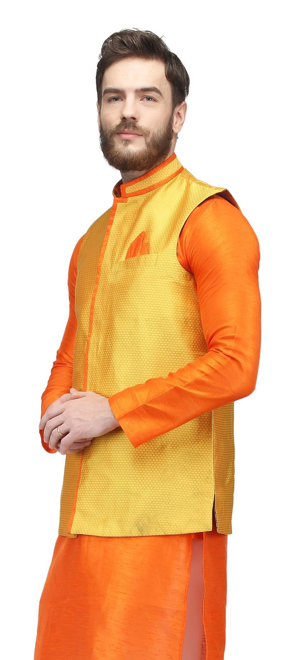 Yellow color Nehru Jacket in Brocade fabric with Thread work