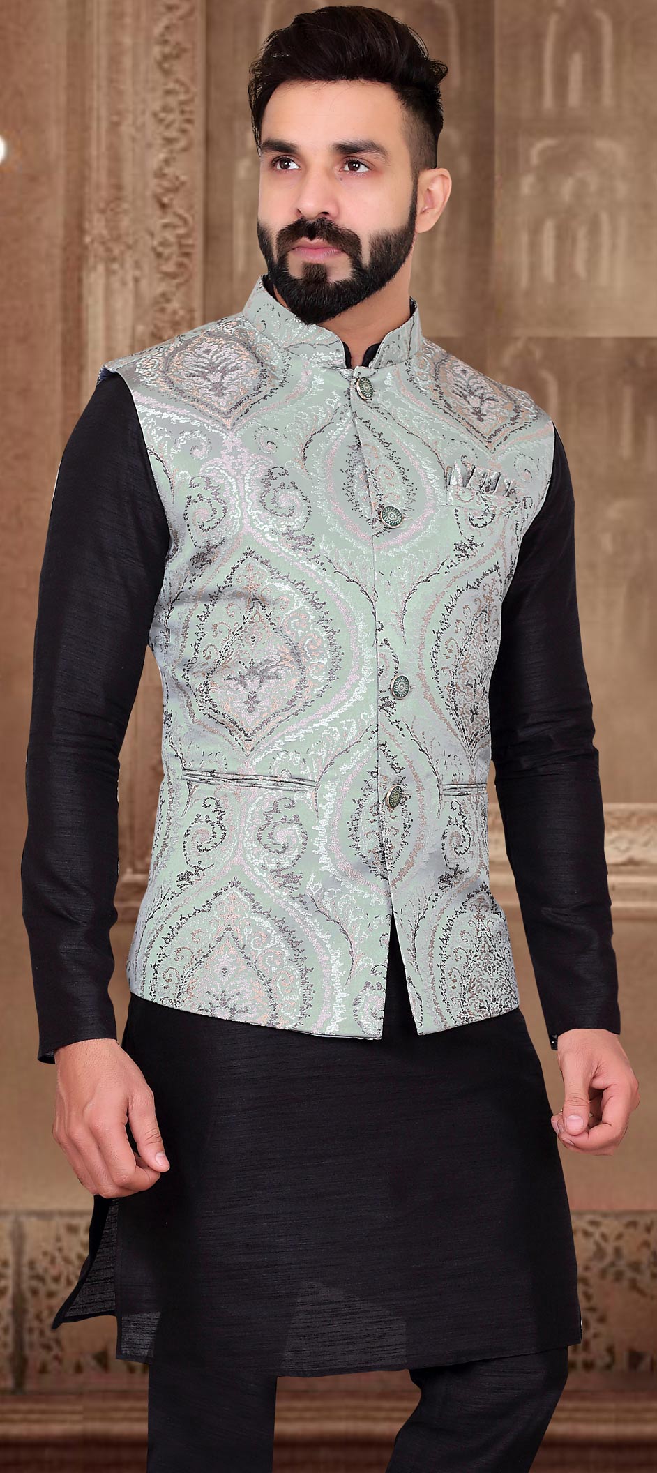 Brocade Nehru Jacket in Black and Grey with Weaving work