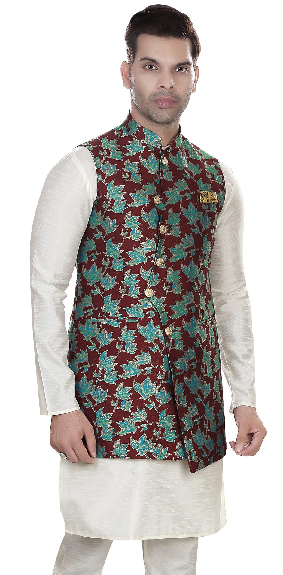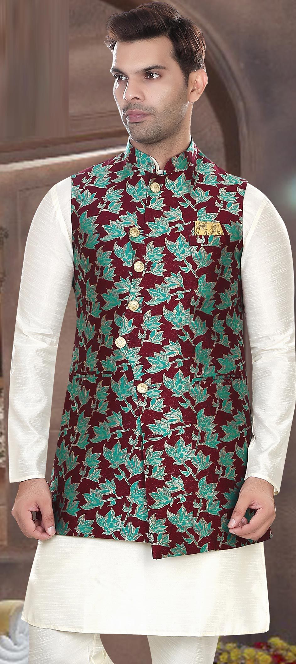 Red and Maroon color Nehru Jacket in Jacquard fabric with Weaving work