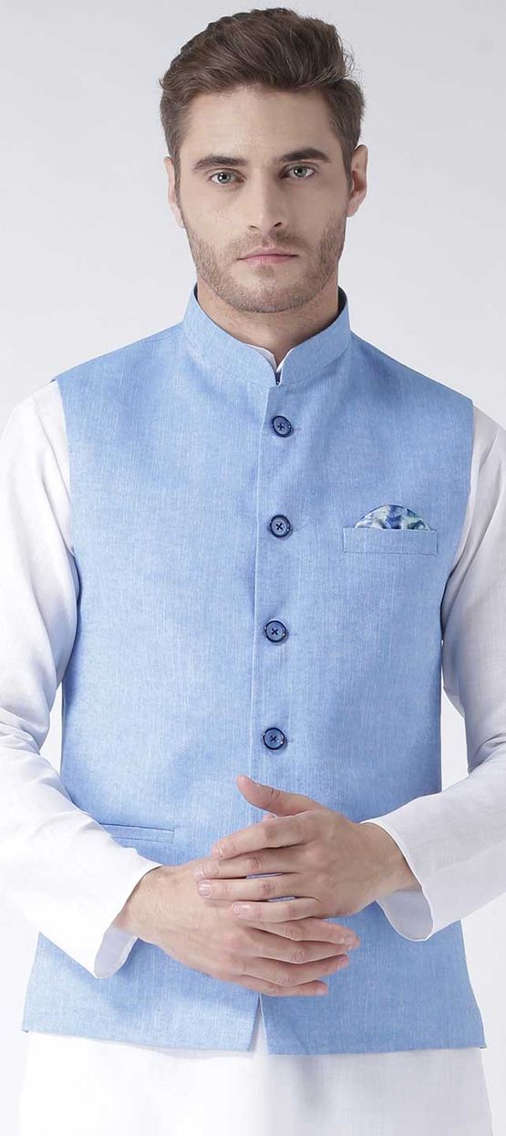 Blue color Nehru Jacket in Linen fabric with Thread work