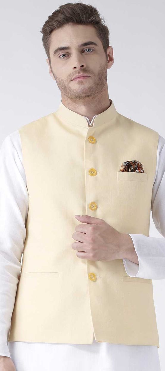 Yellow color Nehru Jacket in Linen fabric with Thread work