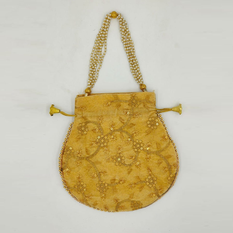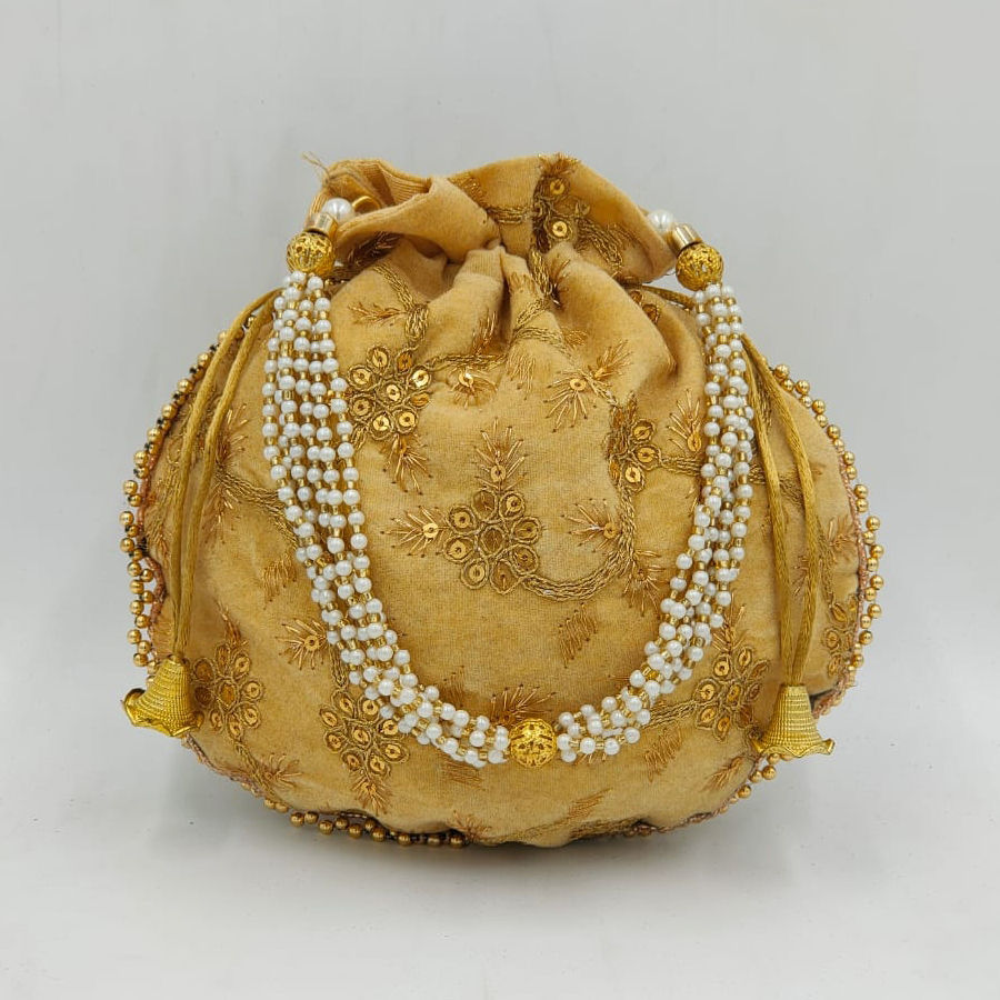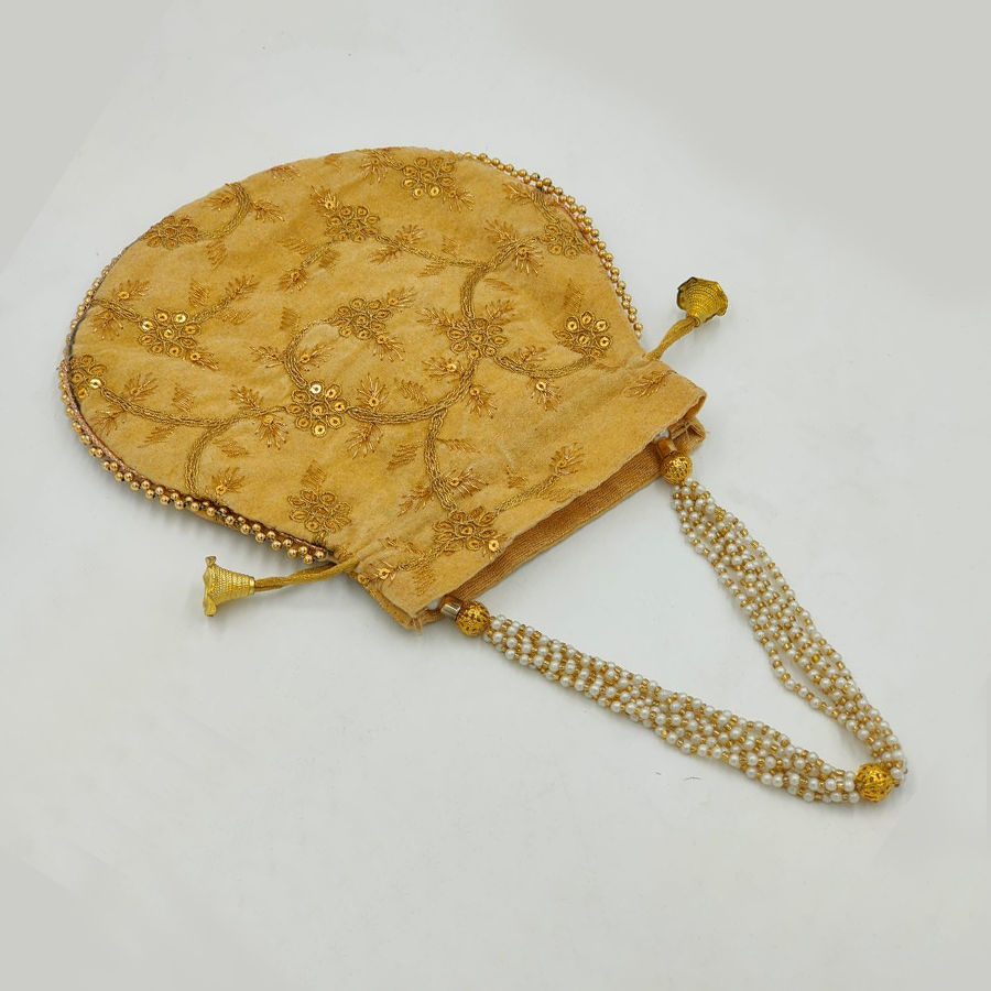 Gold color Potli in Velvet fabric with Embroidered, Sequence work
