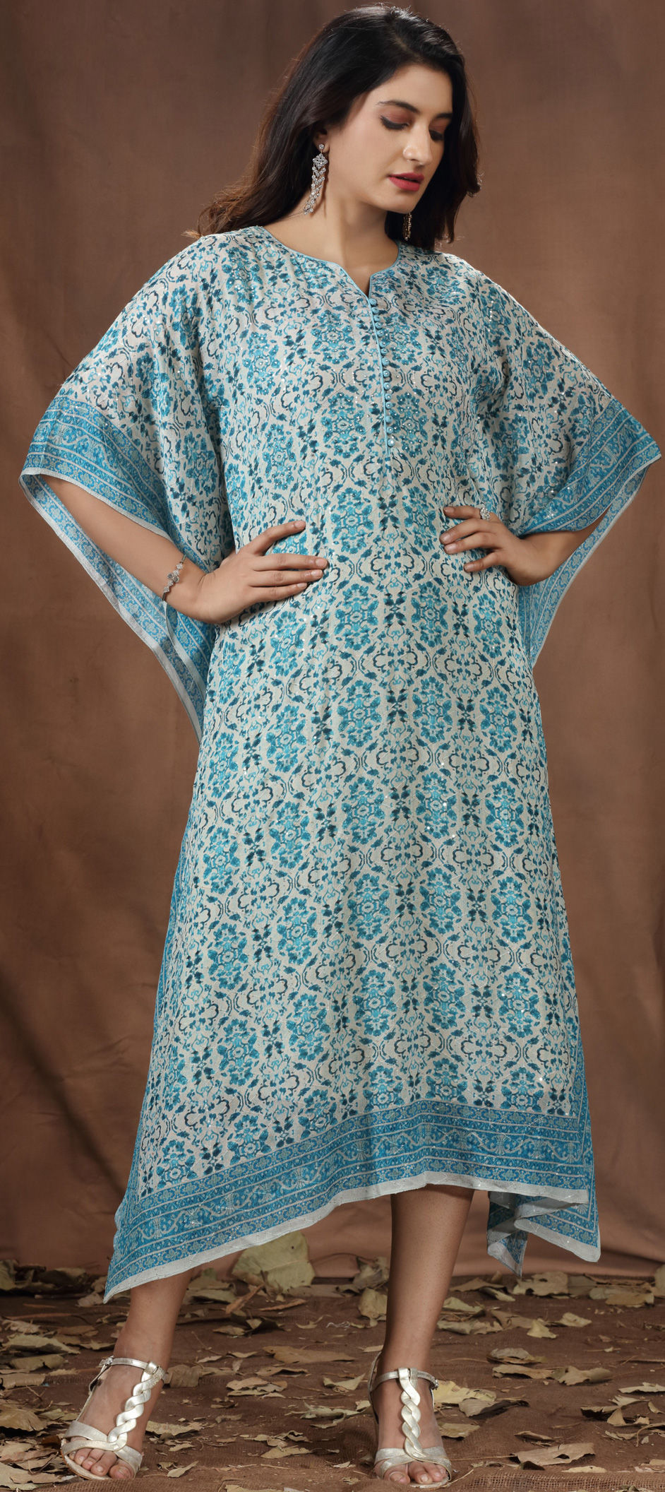 Blue, White and Off White color Kaftan in Art Silk fabric with Printed, Sequence, Thread work