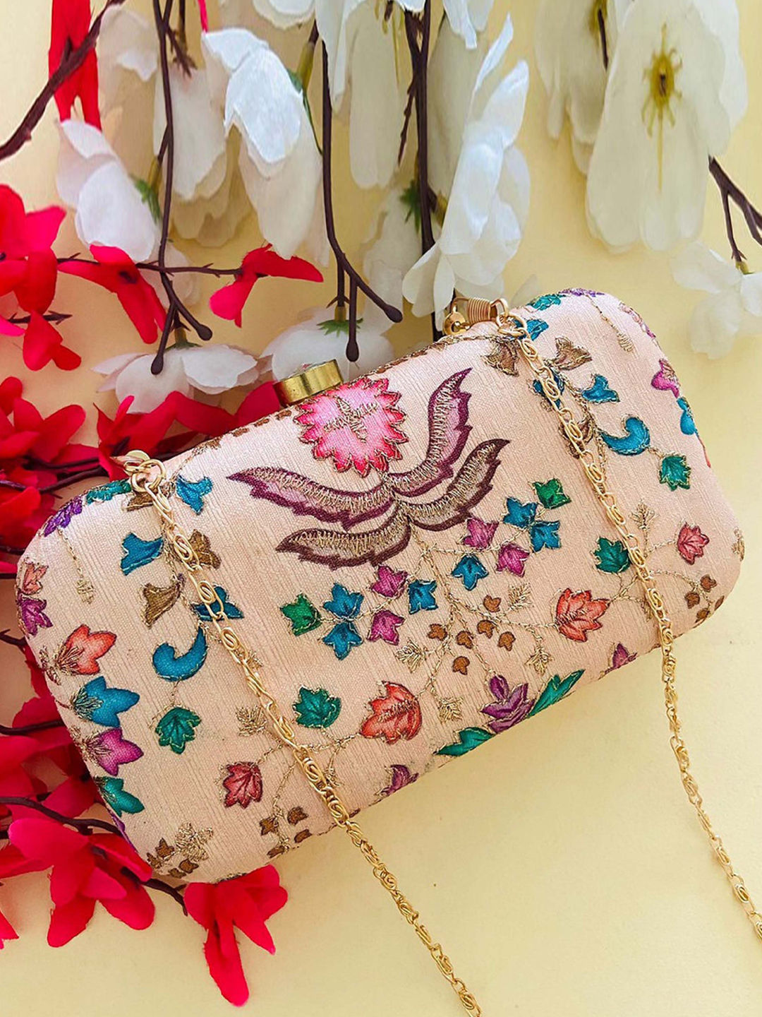 Art Silk Party Wear Clutches in White and Off White with Embroidered work