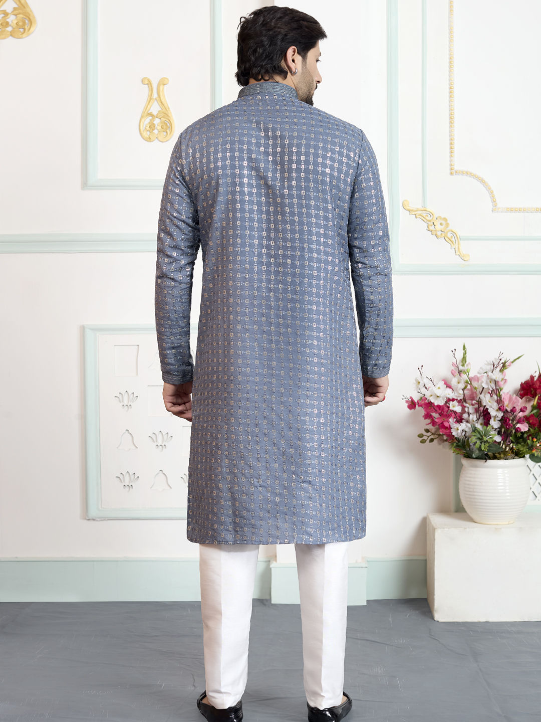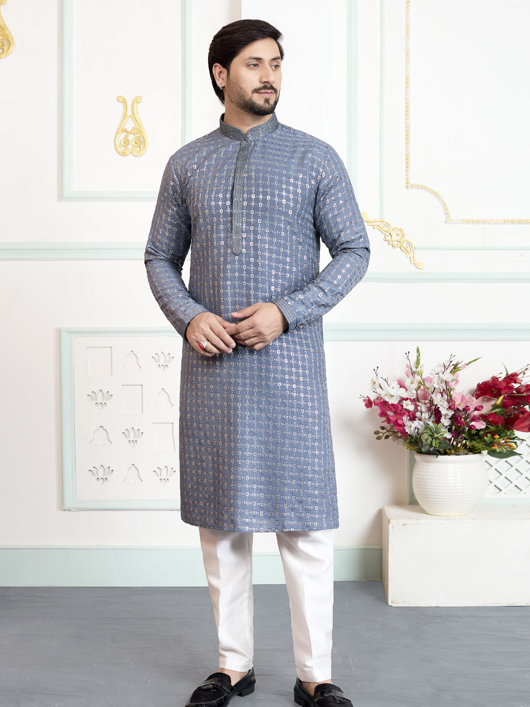 Black and Grey color Kurta Pyjamas in Art Silk fabric with Embroidered work