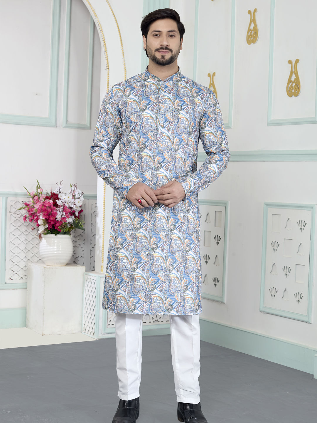 Art Silk Festive Kurta Pyjamas in Blue with Digital Print work