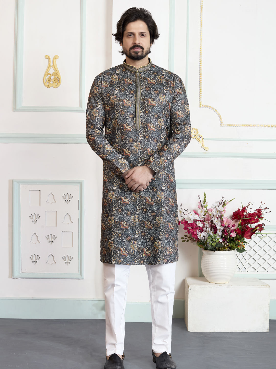 Art Silk Festive Kurta Pyjamas in Black and Grey with Embroidered work