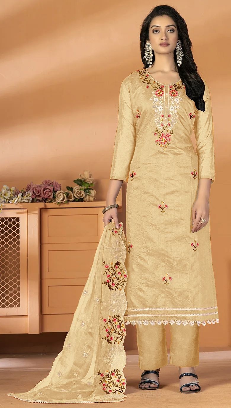 Beige and Brown color Salwar Kameez in Art Silk fabric with Embroidered, Thread work