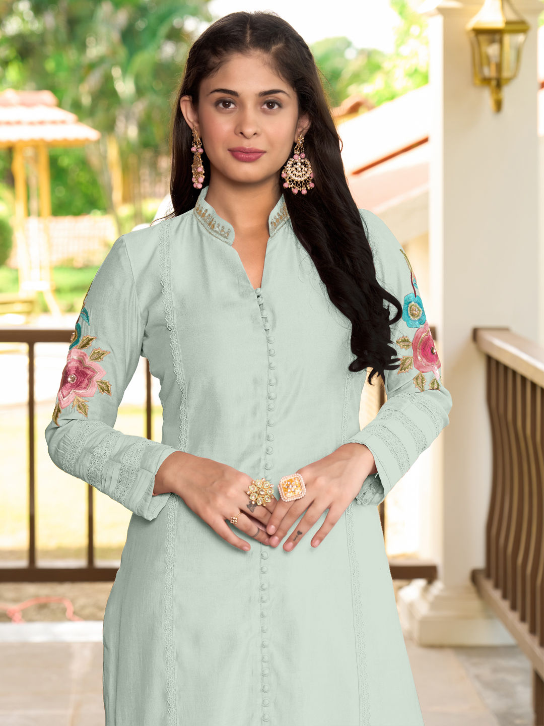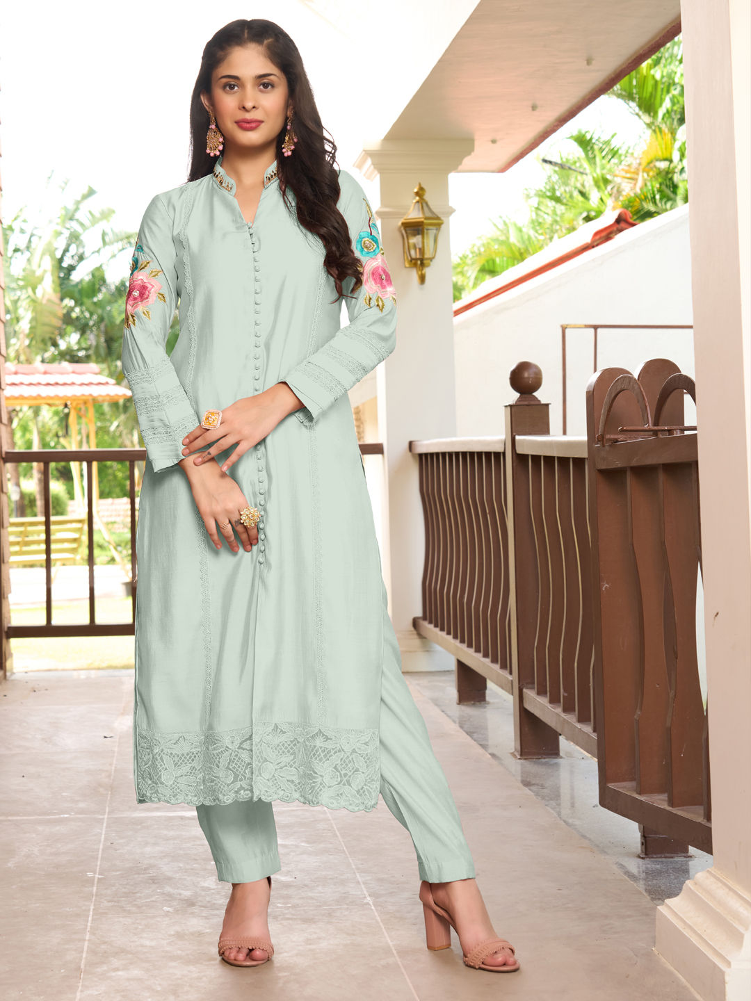 Art Silk Reception Salwar Kameez in Green with Thread work