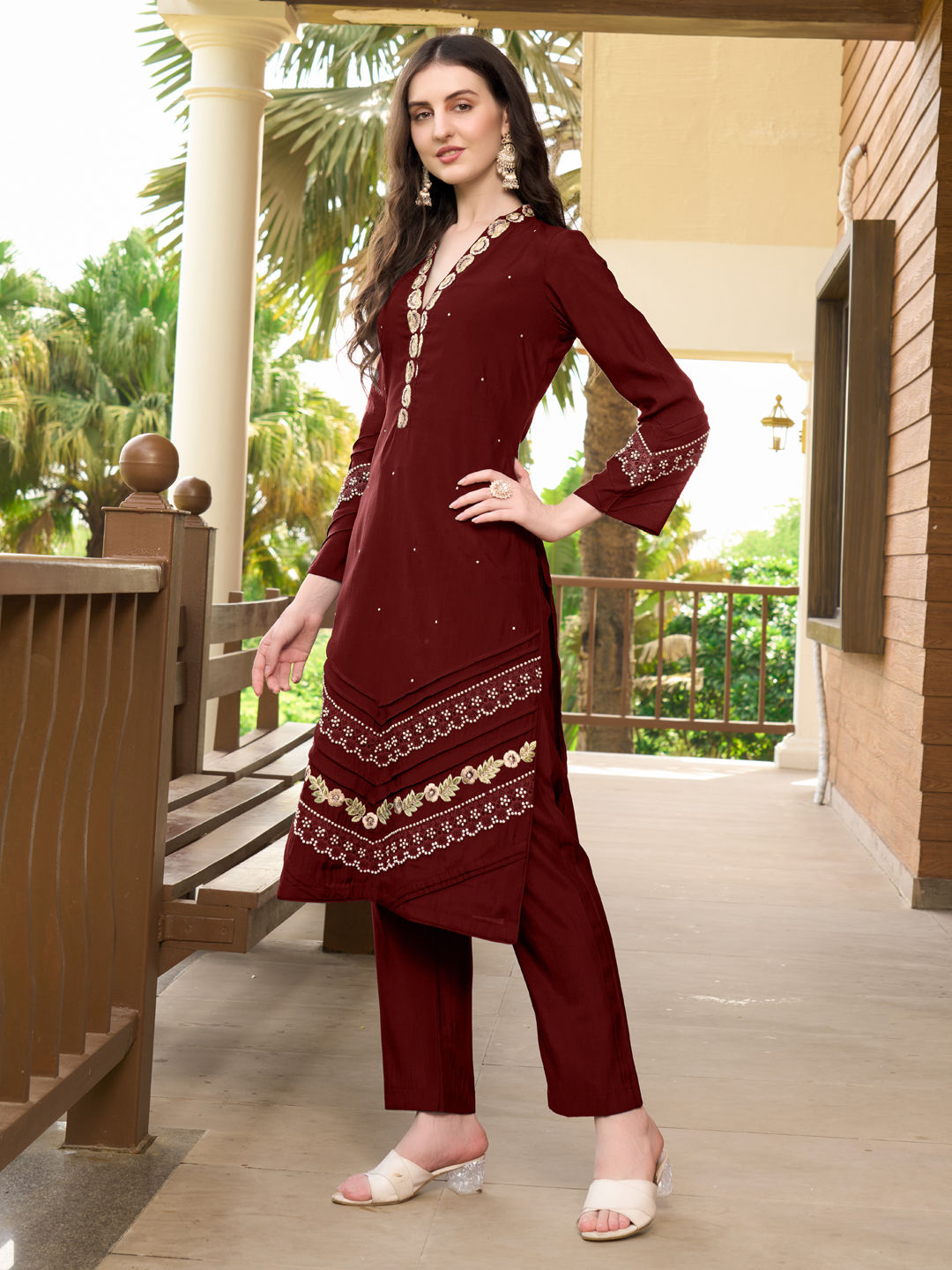 Art Silk Party Wear Salwar Kameez in Red and Maroon with Resham work