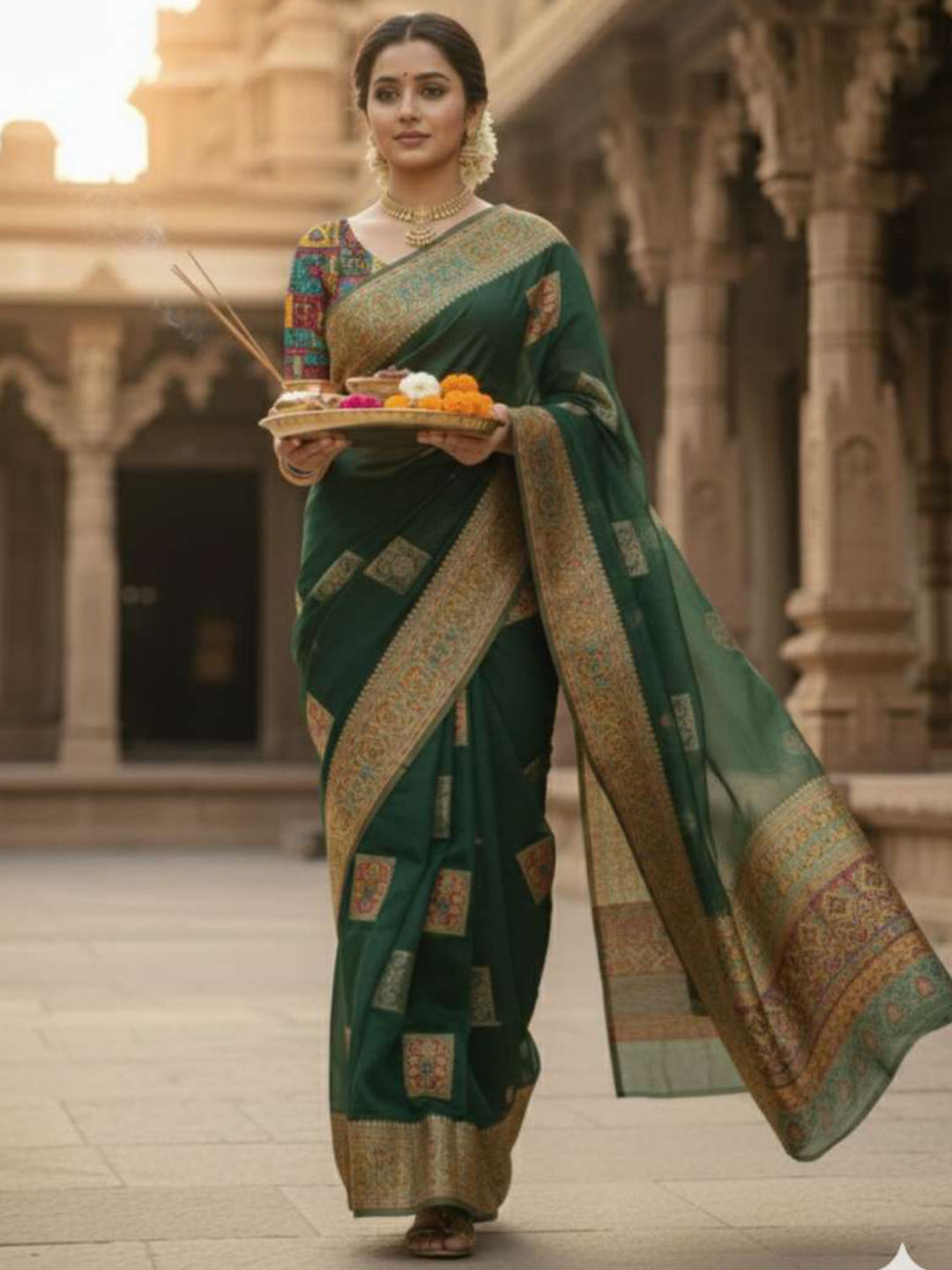 Art Silk Traditional Saree in Green with Zari work