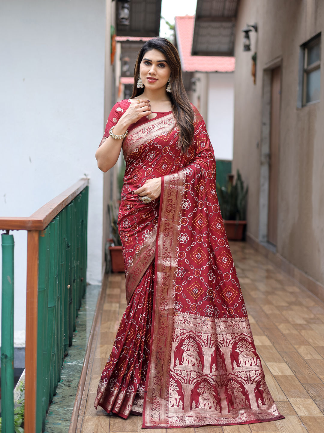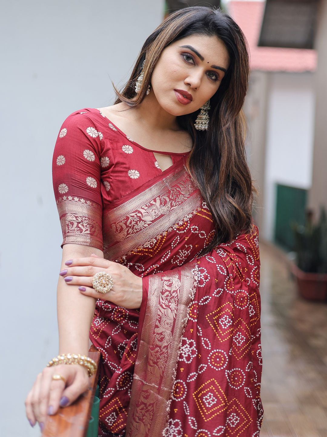 in Red and Maroon with Bandhej work