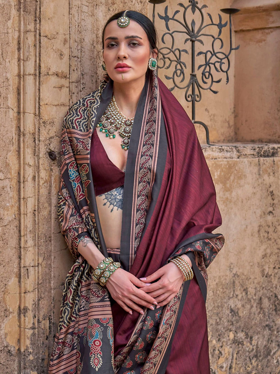 in Red and Maroon with Printed work