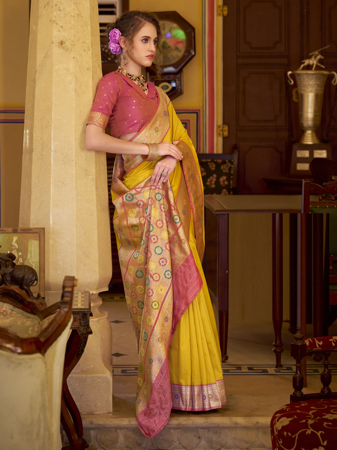 Art Silk Traditional Saree in Yellow with Weaving work