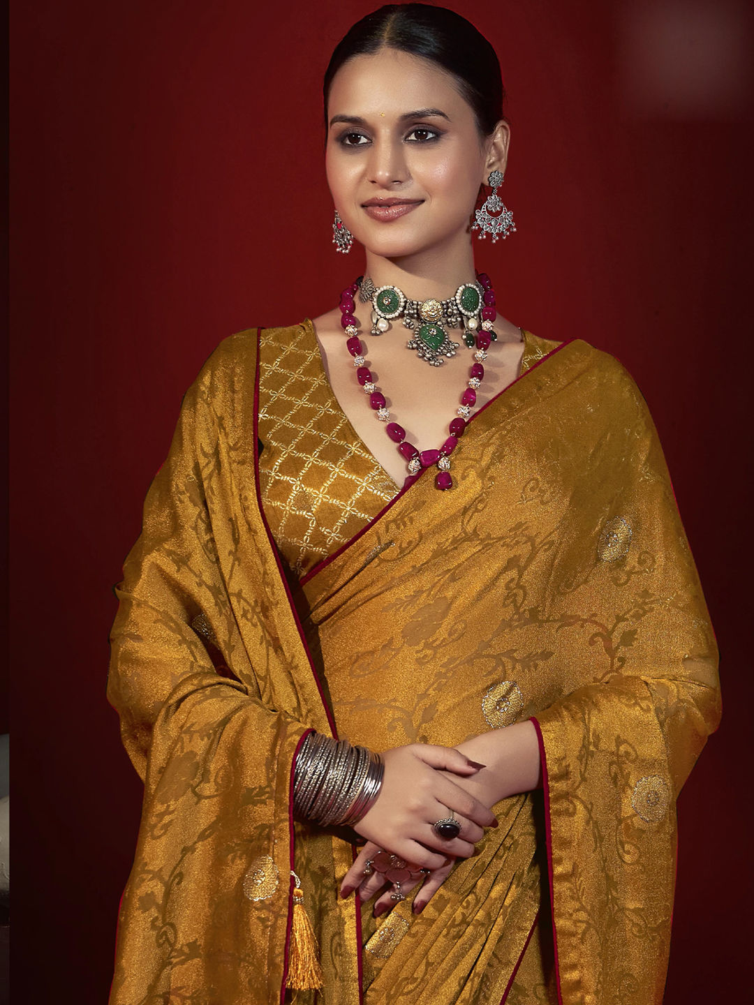 Art Silk Traditional Saree in Red and Maroon with Zari work