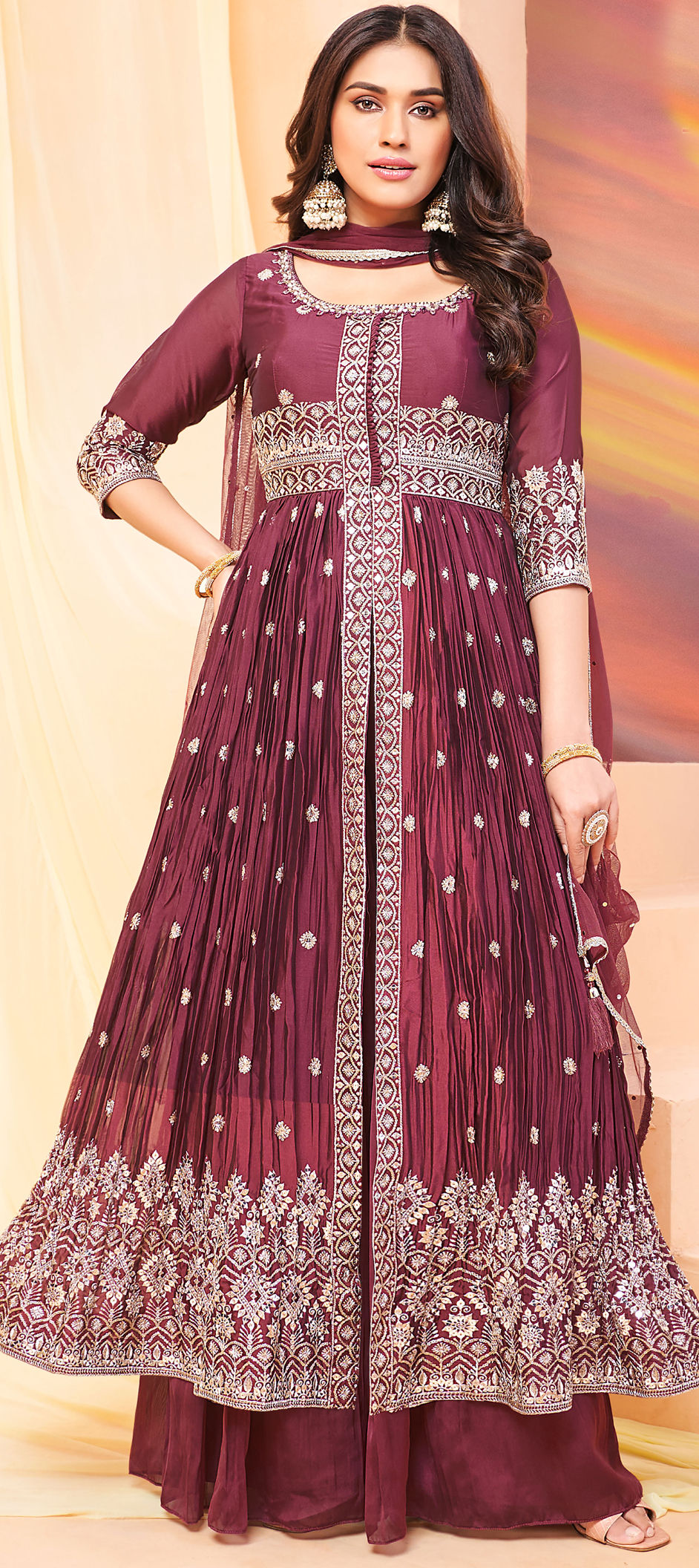 Red and Maroon color Salwar Kameez in Art Silk fabric with Embroidered, Sequence, Thread work