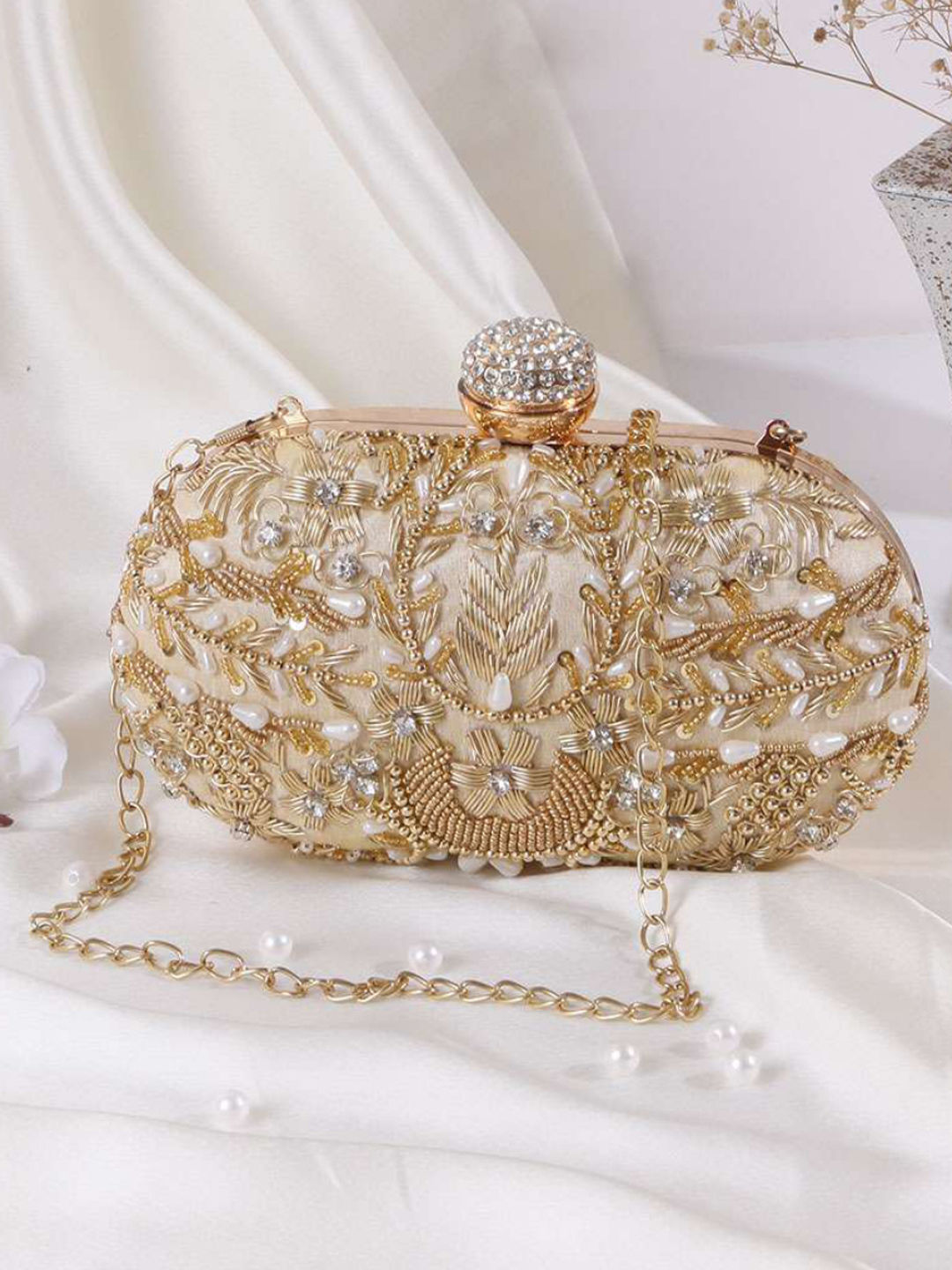 Art Silk Wedding Clutches in White and Off White with Moti work